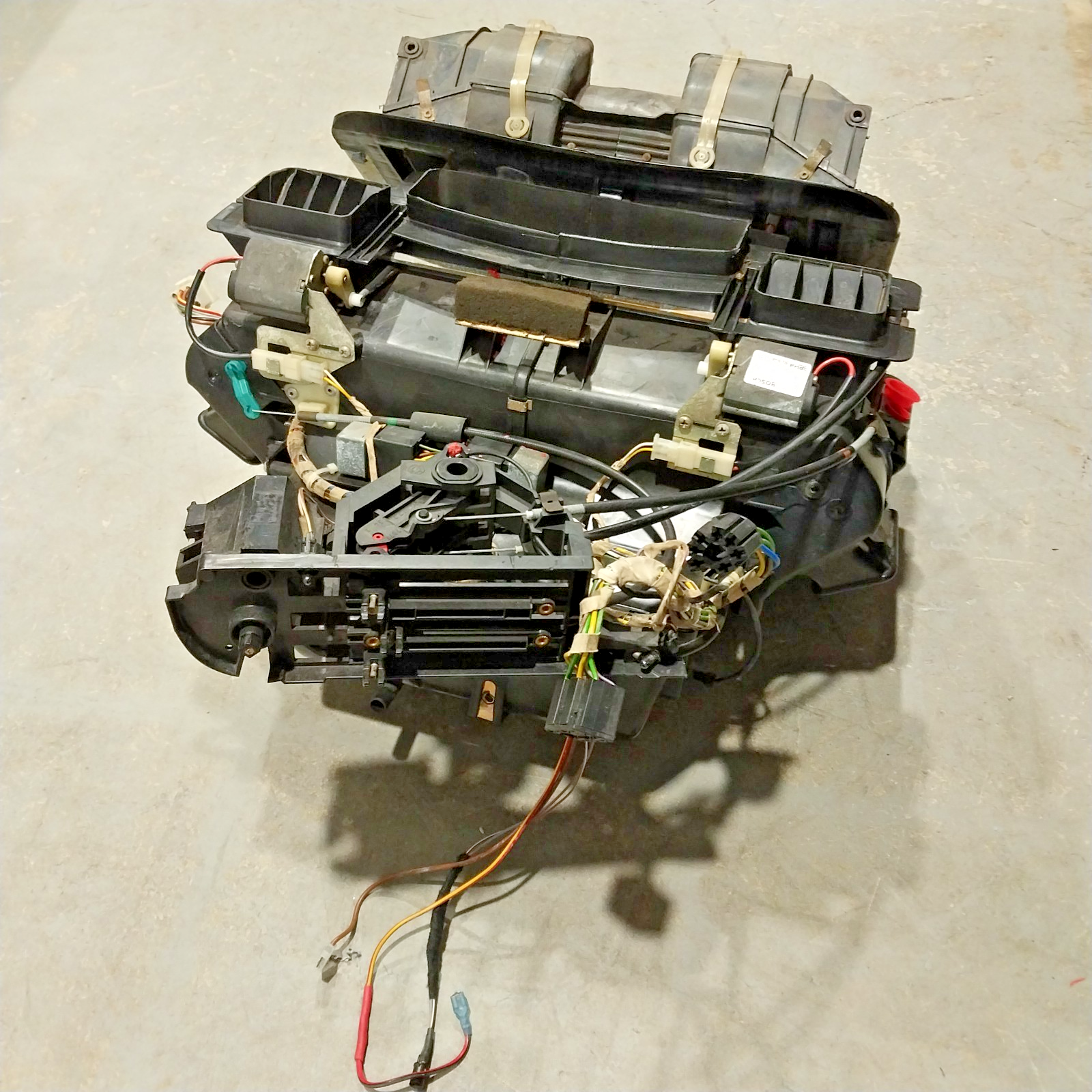 Unit was not fully tested. The heater box flaps, control cables, and recirculation motors were tested and function properly. Some wiring has been repaired. Components that were not tested include the heater core, evaporator, and wiring. Physically the unit is in good overall condition with normal wear from age and use.