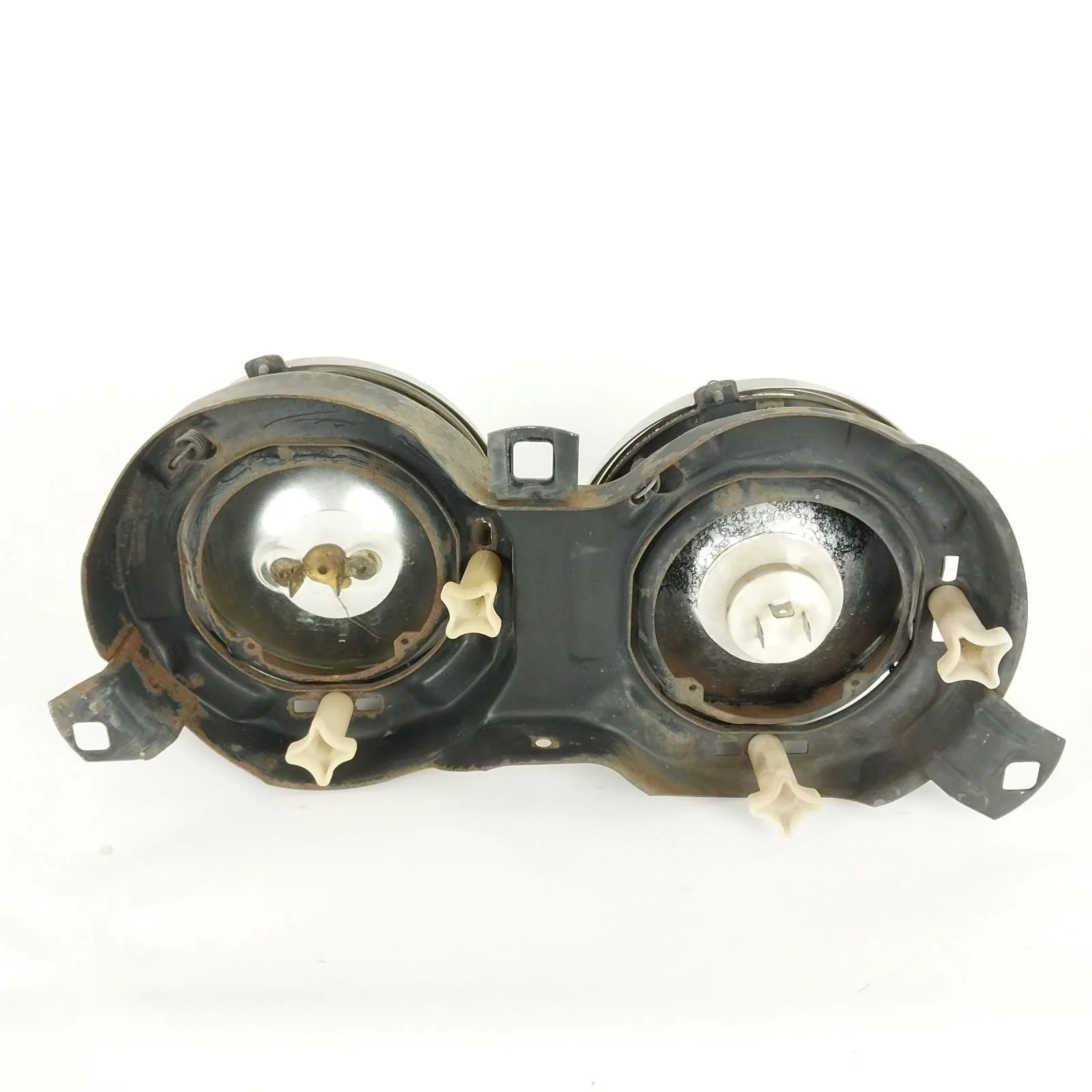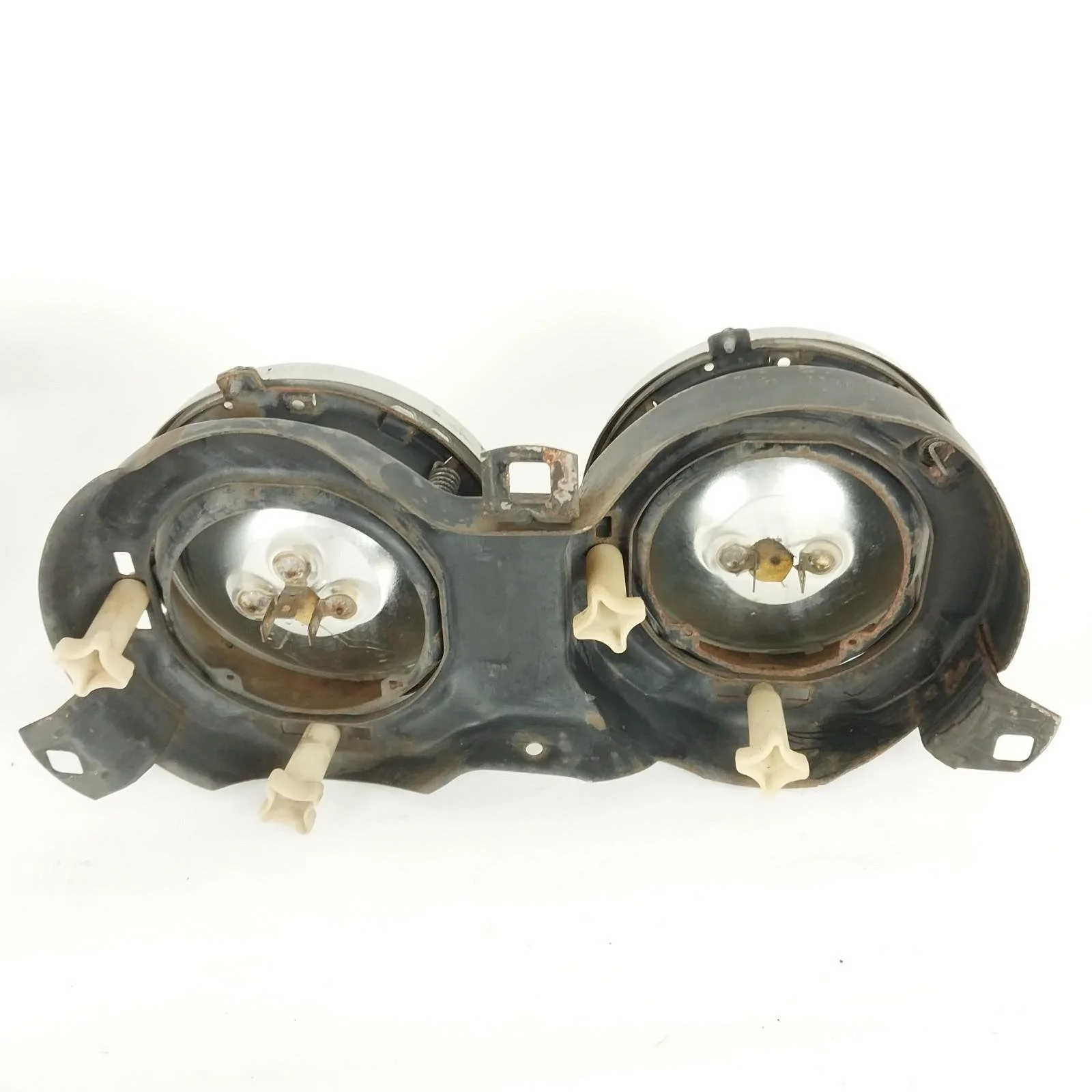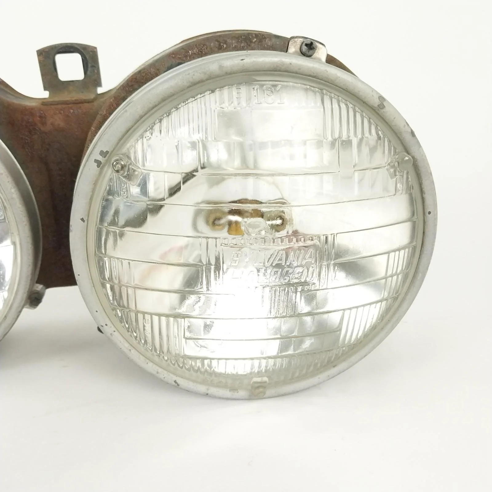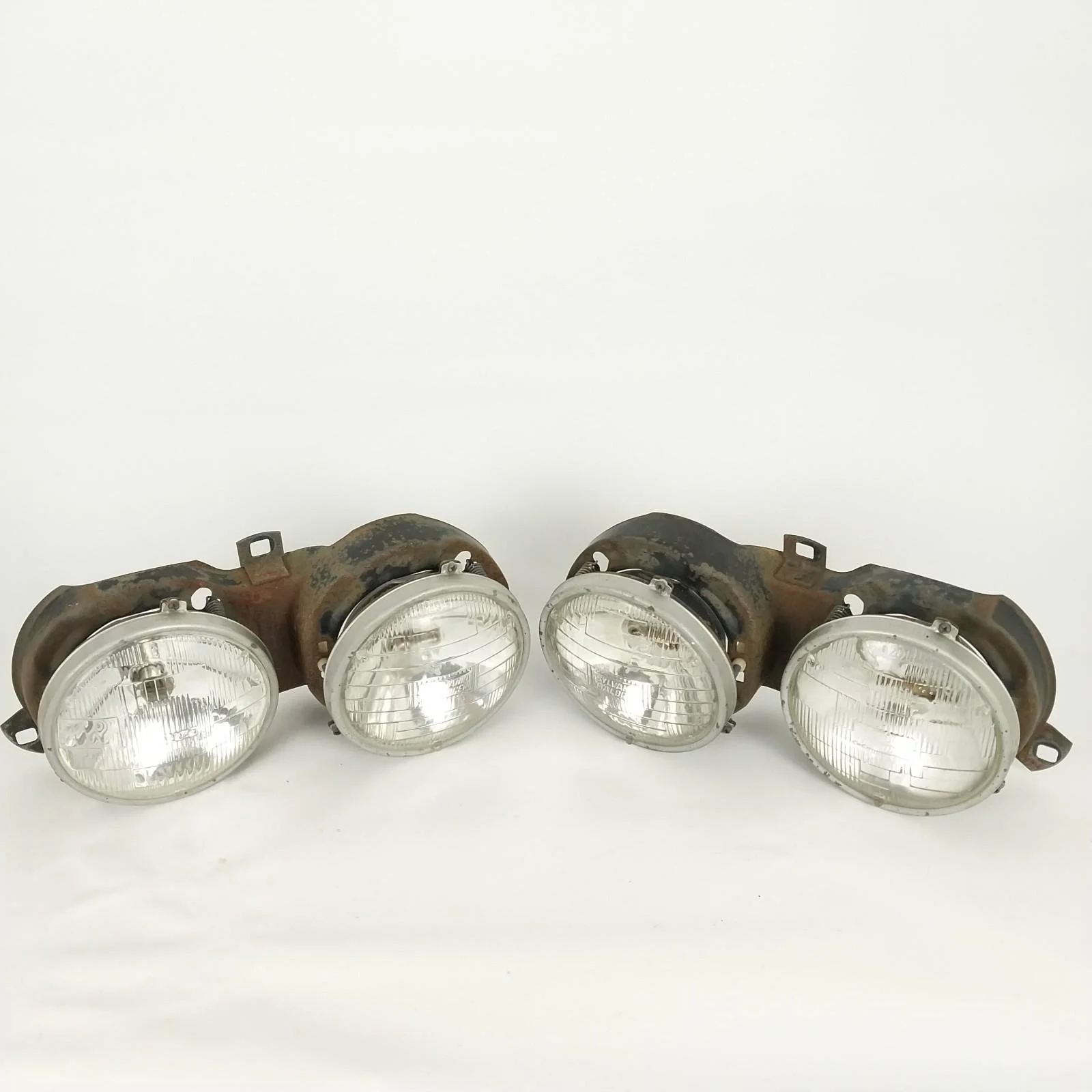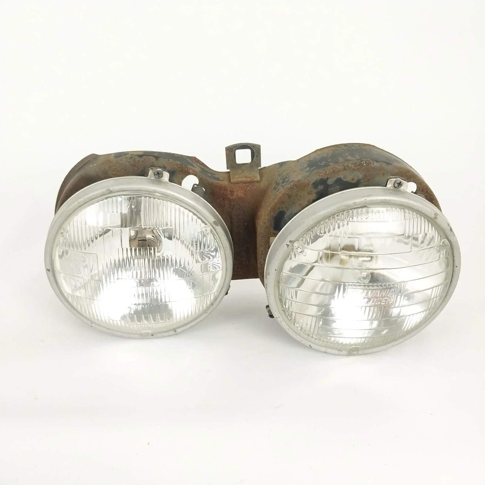 Tested. Left side low beam works but one of the filaments is burnt out. All other lights are in good working order. Left side low beam has a crack / hole in glass. Headlight supporting frames both have surface rust. See pictures for condition.