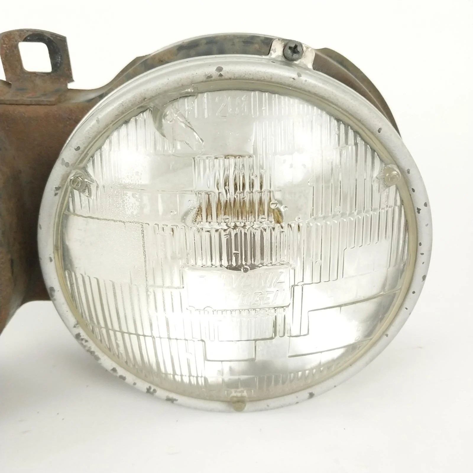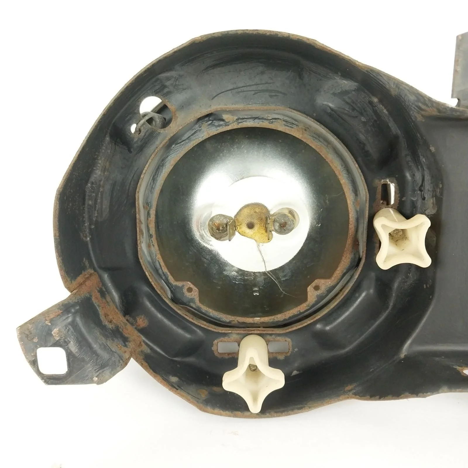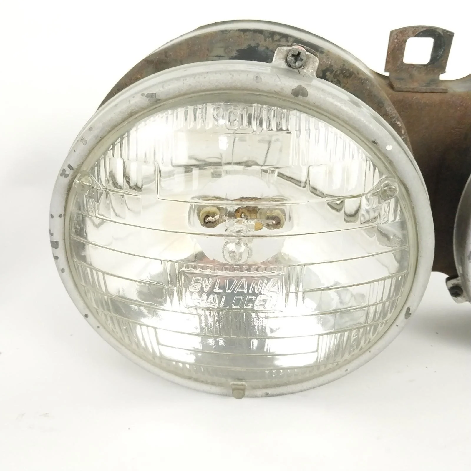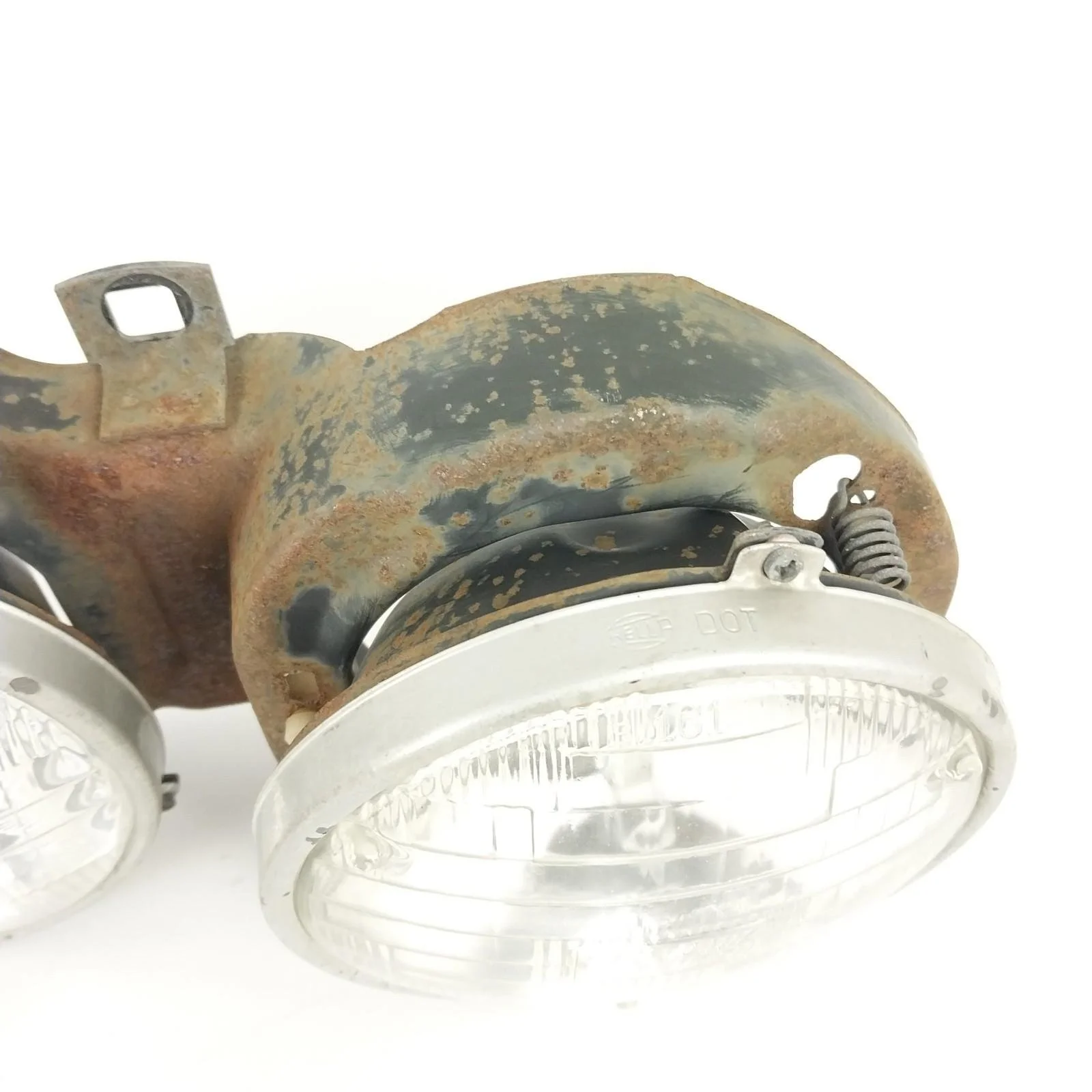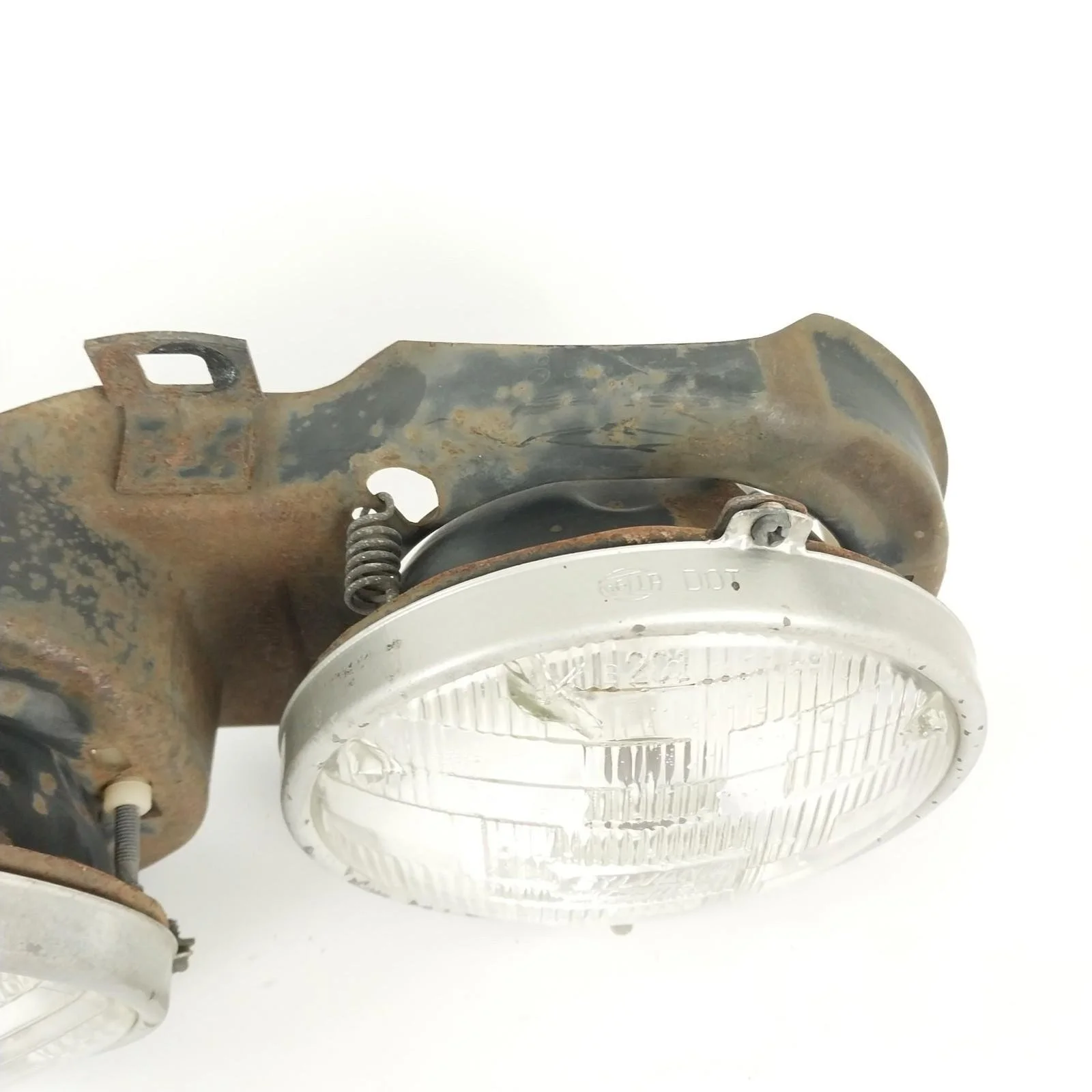 Tested. Left side low beam works but one of the filaments is burnt out. All other lights are in good working order. Left side low beam has a crack / hole in glass. Headlight supporting frames both have surface rust. See pictures for condition.